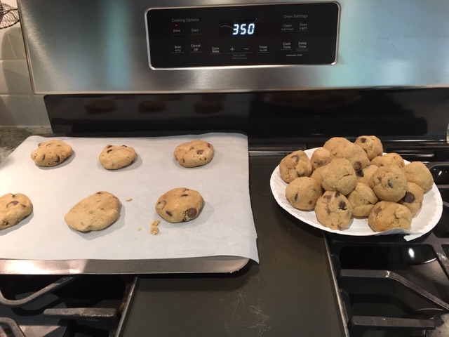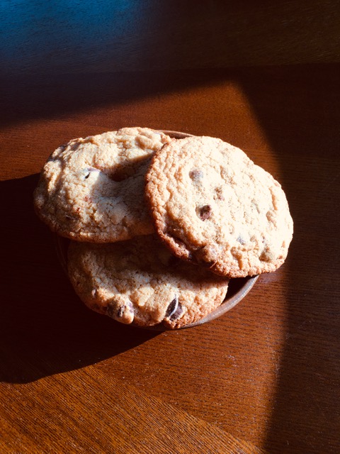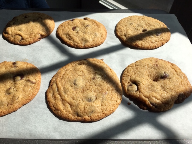 Most important part: put the bowl with the dough in the refrigerator for at least an hour (best result: overnight). When ready to bake, preheat the oven to 350. Take the bowl of dough out of the fridge and let come to room temperature (I place it on top of the stove to warm up a bit as the oven preheats). Using an ice cream scoop, scoop balls of dough. Roll each ball and then squish it flat on the parchment lined baking sheets. You’ll end up with about six cookies per sheet. Bake to desired doneness. (I like them only slightly golden brown, still chewy in the middle.)